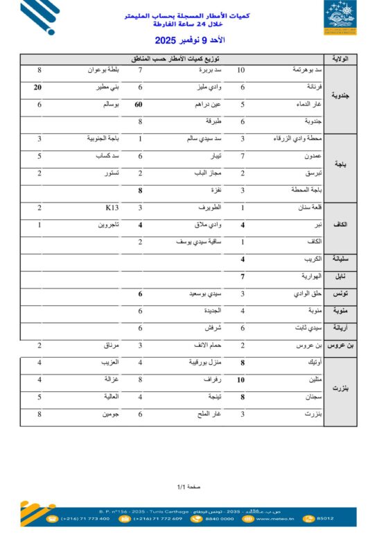 insert_link أخبار-وطنية الأحد :أمطار غزيرة بهذه المناطق يشهد طقس اليوم بالشمال أحياناً سحباً كثيفة ترافقها أمطار متفرقة ومؤقتاً رعدية، تكون محلياً غزيرة خاصة بأقصى الشمال الغربي، مع إمكانية تساقط البرد في بعض المناطق المحدودة، في حين تكون السحب عابرة ببقية الجهات. الرياح من القطاع الغربي، قوية بالشمال والوسط وضعيفة فمعتدلة بالجنوب، وتتجاوز مؤقتاً 80 كلم/س في شكل هبات خاصة أثناء السحب الرعدية. البحر شديد الاضطراب بالشمال ومضطرب فمحلياً شديد الاضطراب ببقية السواحل. وتتراوح درجات الحرارة القصوى بين […] today9 نوفمبر 2025