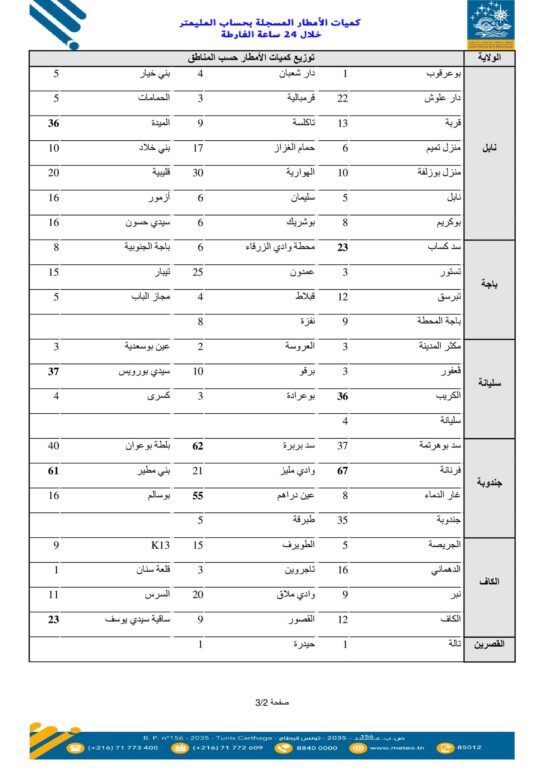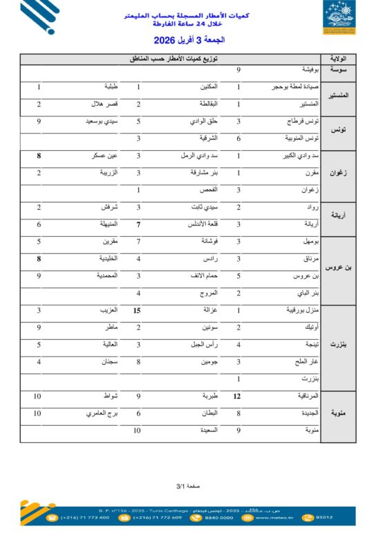 يتميز طقس اليوم بظهور سحب كثيفة مع أمطار متفرقة بالشمال ثم تشمل محليا الوسط بعد الظهر وتكون مؤقتا رعدية بأقصى الشمال الغربي وسحب عابرة ببقية المناطق. - الريح شمالية غربية قوية قرب السواحل وبالمرتفعات ومعتدلة إلى قوية نسبيا ببقية المناطق. - البحر شديد الاضطراب إلى مضطرب بالسواحل الشرقية. - الحرارة في ارتفاع طفيف وتتراوح القصوى بين 12 و 17 درجة بالشمال و الوسط الغربي وتكون في حدود 10 درجات بالمرتفعات […]
