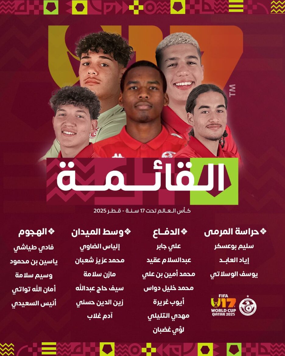 insert_link رياضة كأس العالم تحت 17 عام : قائمة المنتخب الوطني التونسي يشارك المنتخب الوطني التونسي في مسابقة كأس العالم تحت 17 عام و المقامة في قطر و في ما يلي القائمة المستدعاة : حراس المرمى : سليم بوعسكر - إياد العابدي - يوسف الوسلاتي خط الدفاع : علي جابر - عبد السلام عقيد - محمد أمين بن علي - محمد خليل دواس - أيوب غريرة - مهدي التليلي - لؤي غضبان وسط الميدان : إلياس الضاوي - محمد عزيز شعبان - […] today22 أكتوبر 2025