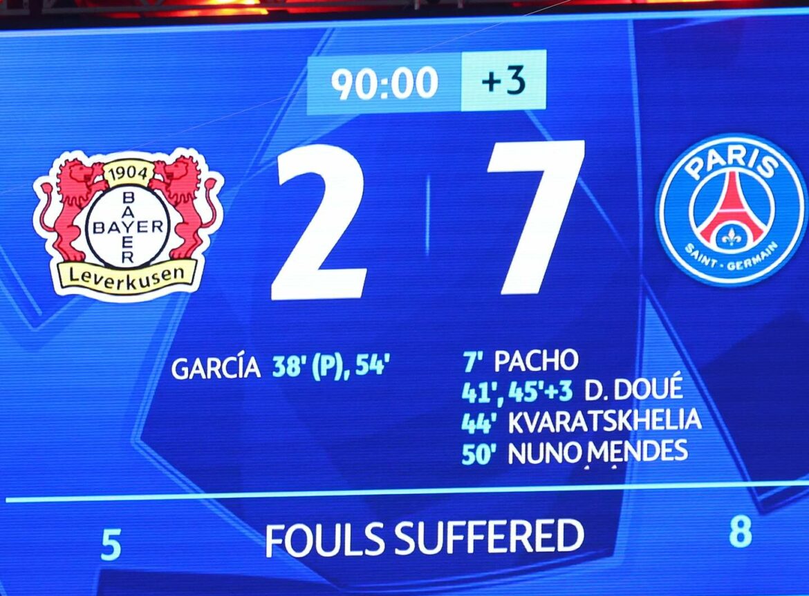 insert_link رياضة دوري أبطال أوروبا : إنتصار عريض لباريس سان جيرمان أمام ليفركوزن يجعله في الصدارة بفارق الأهداف في إطار الجولة الثالثة من مرحلة الدوري لبطولة دوري أبطال أوروبا حقق باريس سان جيرمان فوزا عريضا على باير ليفركوزن بنتيجة 7-2 , أهداف كل من المدافع الإكوادوري ويليان باتشو في الدقيقة السابعة , الجناح الفرنسي ديزيري دواي في الدقائق 41 و الدقيقة لثالثة من الوقت بدل الضائع للشوط الأول , الجناج الجورجي خفيتشا غفاراتسخيليا في الدقيقة 44 , الضهير البرتغالي نونو مينديز في الدقيقة 50 , الجناح الفرنسي عثمان […] today22 أكتوبر 2025