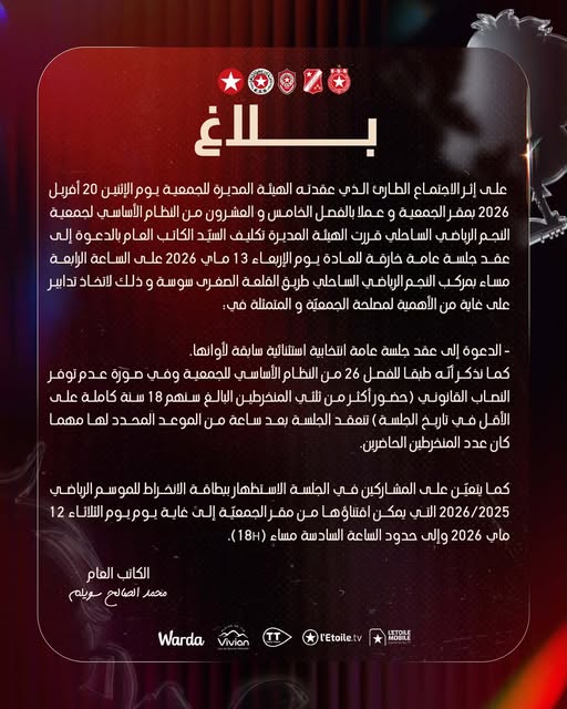 اصدرت الهيئة المديرة للمستقبل الرياضي بسليمان بلاغا عبرت فيه عن بالغ استغرابها واحتجاجها على القرار الصادر عن الرابطة التونسية لكرة القدم والقاضي بعدم تمكين الفريق من خوض مباراته القادمة ضد النادي الإفريقي بالملعب البلدي بالكرم ، وفي مايلي نص البلاغ : تُعبّر الهيئة المديرة لـ المستقبل الرياضي بسليمان عن بالغ استغرابها واحتجاجها على القرار الصادر عن الرابطة التونسية لكرة القدم والقاضي بعدم تمكين الفريق من خوض مباراته القادمة ضد النادي […]