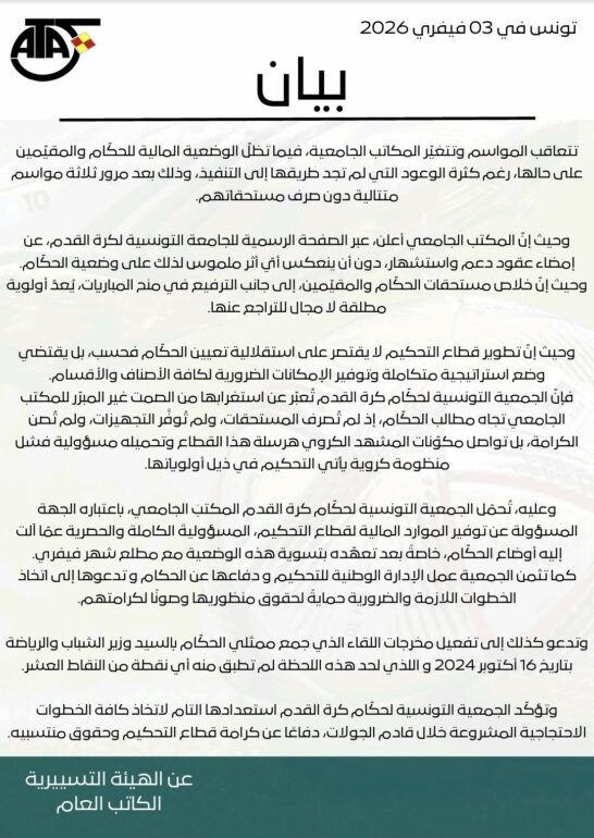 أصدرت الجمعية التونسية لحكام كرة القدم بياناً شديد اللهجة عبرت فيه عن استيائها العميق من تدهور الوضعية المالية للحكام والمقيمين، مشيرة إلى أن الأزمة تراوح مكانها منذ ثلاثة مواسم متتالية دون حلول ملموسة. وانتقدت الجمعية صمت المكتب الجامعي لكرة القدم، معتبرة أن الإعلانات الرسمية عن إبرام عقود دعم واستشهار لم تنعكس واقعياً على مستحقات الحكام . وأكد البيان أن خلاص الديون المتراكمة والترفيع في منح المباريات يمثل أولوية مطلقة لا تقبل التراجع. وشددت الجمعية على أن تطوير قطاع التحكيم لا يتوقف عند تعيين الحكام، بل يتطلب استراتيجية متكاملة تشمل توفير الإمكانيات اللوجستية والمعدات الضرورية لكافة الأصناف. وحملت الجمعية المكتب الجامعي المسؤولية الكاملة عن توفير الموارد المالية، خاصة بعد الوعود التي قُدمت بتسوية الوضعية مع مطلع شهر فيفري الحالي. وأشار البيان إلى “تجاهل” مخرجات الاجتماع الذي جمع ممثلي الحكام بوزير الشباب والرياضة في 16 أكتوبر 2024، حيث لم يتم تطبيق أي نقطة من النقاط العشر المتفق عليها آنذاك. وفي ختام بيانها، أعلنت الجمعية عن استعدادها التام لاتخاذ كافة الخطوات الاحتجاجية المشروعة خلال الجولات القادمة، وذلك دفاعاً عن كرامة قطاع التحكيم وحقوق منظوريه، مؤكدة أنها لن تظل صامتة أمام “هرسلة” القطاع وتحميله مسؤولية فشل المنظومة الكروية. وفي مايلي نص البيان :