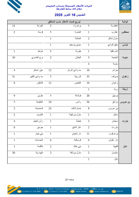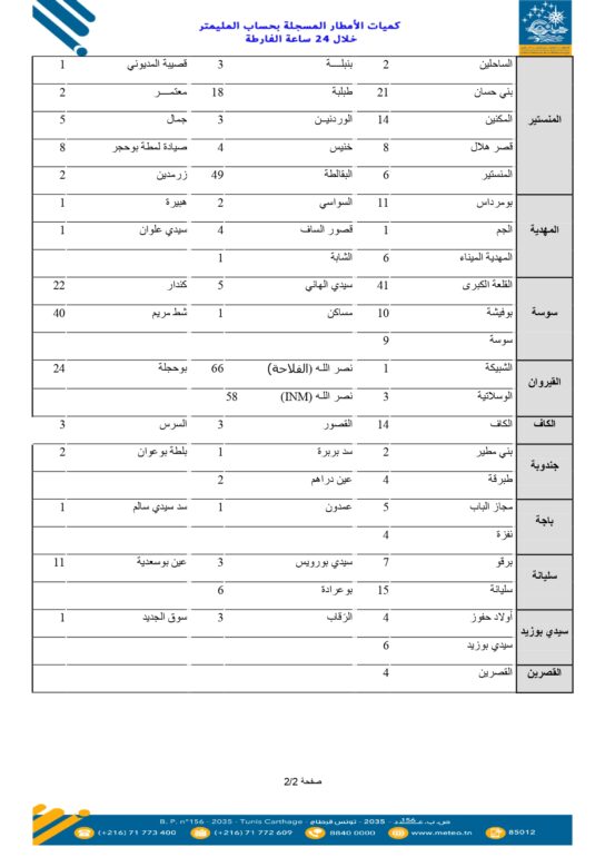 شهدت عدة ولايات نزول كميات من الأمطار، حيث سجلت معتمدية نصر الله بالقيروان أعلى كمية ب66 ملم خلال الـ24 ساعة الماضية.