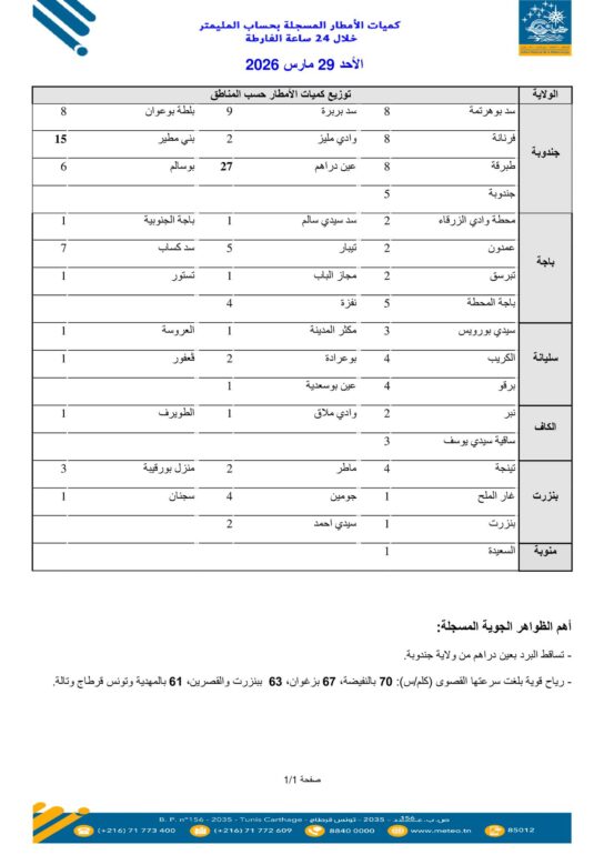 عين دراهم تسجل أعلى نسبة أمطار بـ27 مم