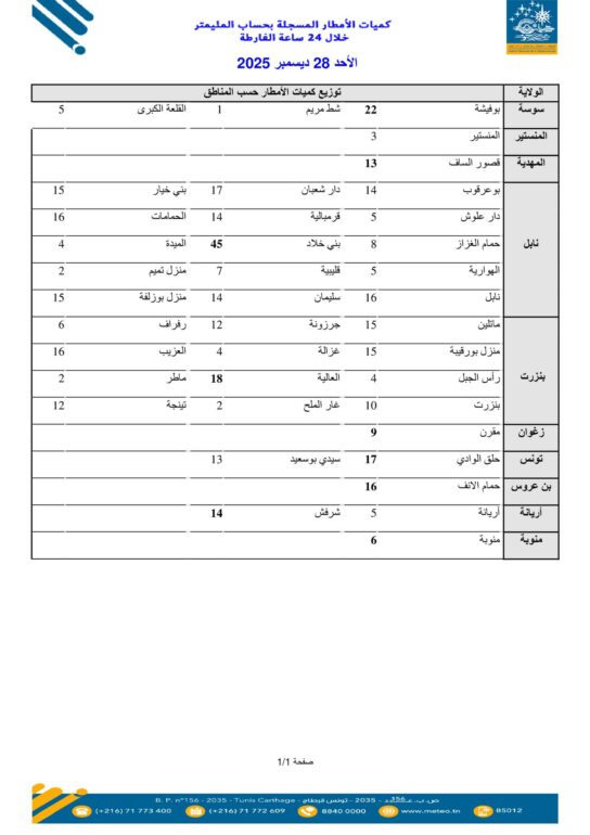 insert_link رياضة الكرة الطائرة : نتائج مقابلات الجولة الثانية إياب من بطولة القسم الوطني “أ” و الترتيب أقيمت مساء يوم أمس السبت 27 ديسمبر 2025 مقابلات الجولة الثانية إياب من بطولة القسم الوطني "أ" للكرة الطائرة و في ما يلي النتائج و الترتيب : المجموعة الأولى : الترجي الرياضي التونسي 3-0 سعيدية سيدي بوسعيد الزيتونة الرياضية 0-3 مستقبل المرسى مولودية بوسالم 3-0 الأولمبي القليبي الترتيب : 1- الترجي الرياضي التونسي 19 نقطة 2- مولودية بوسالم 16 نقطة 3- الأولمبي القليبي 13 نقطة 4- سعيدية سيدي بوسعيد 8 […] today28 ديسمبر 2025
