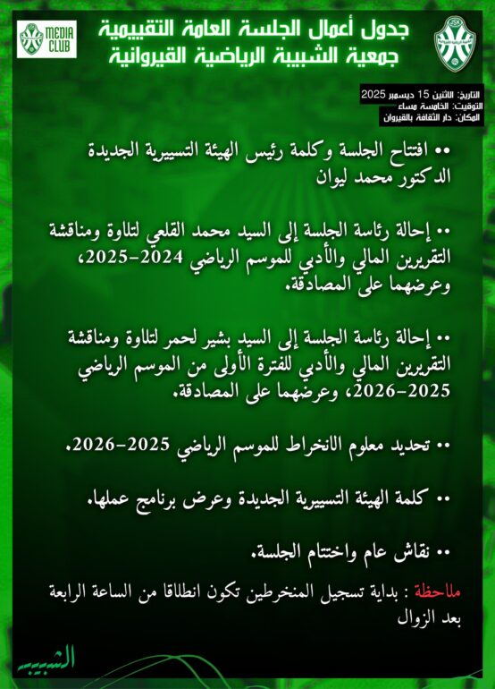 insert_link رياضة البطولة الوطنية المحترفة لكرة السلة في مايلي برنامج مباريات الجولة الرابعة إيابًا للبطولة الوطنية المحترفة لكرة السلة، التي ستدور غدًا الثلاثاء 16 ديسمبر 2025 : المجموعة الأولى : 16:00 النادي الإفريقي - نجم حلق الوادي 18:00 الدالية الرياضية بقرمبالية - النجم الساحلي 18:00 نادي كرة السلة بالمهدية - شبيبة المنازه المجموعة الثانية : 16:00 الشبيبة القيروانية - اتحاد الأنصار 18:00 الاتحاد المنستيري - الملعب النابلي 18:00 النجم الرادسي - جمعية الحمامات today15 ديسمبر 2025