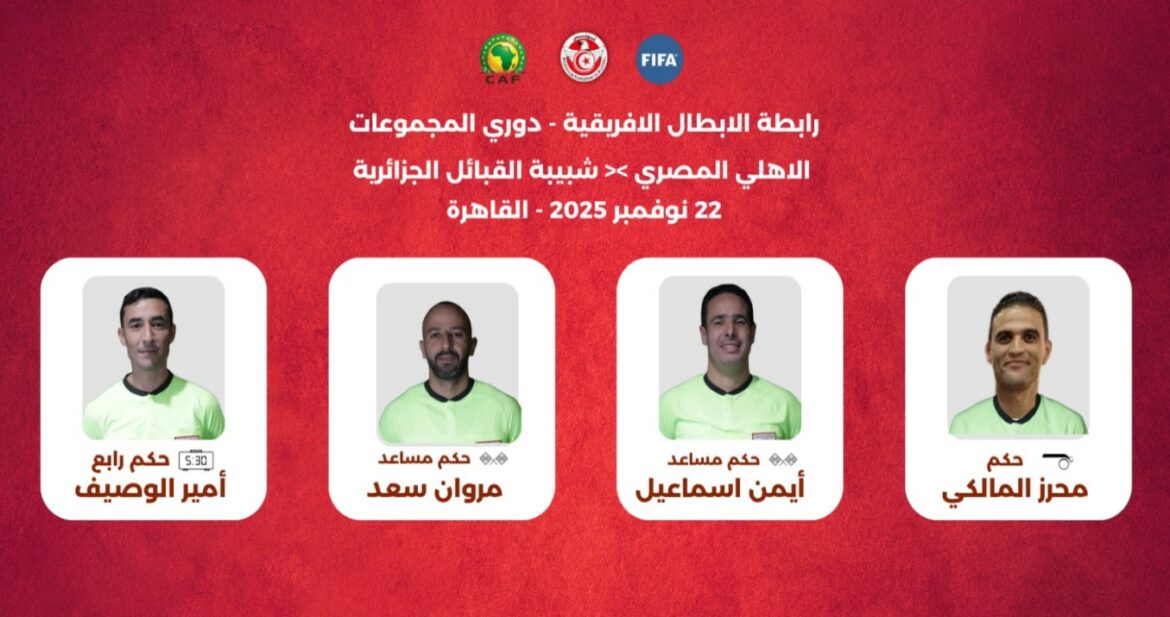 insert_link رياضة بقيادة الحكم الدولي محرز المالكي أعلن الاتحاد الإفريقي لكرة القدم عن تعيين طاقم تحكيم تونسي بقيادة محرز المالكي لإدارة مباراة الجولة الأولى من دور مجموعات لمسابقة دوري أبطال إفريقيا ، التي تجمع بين الأهلي المصري وشبيبة القبائل الجزائري يوم 22 نوفمبر الجاري بالعاصمة المصرية القاهرة. وسيساعد المالكي كل من أيمن إسماعيل ومروان سعد، فيما أُسندت مهمة الحكم الرابع لـ أمير لوصيف . today14 نوفمبر 2025