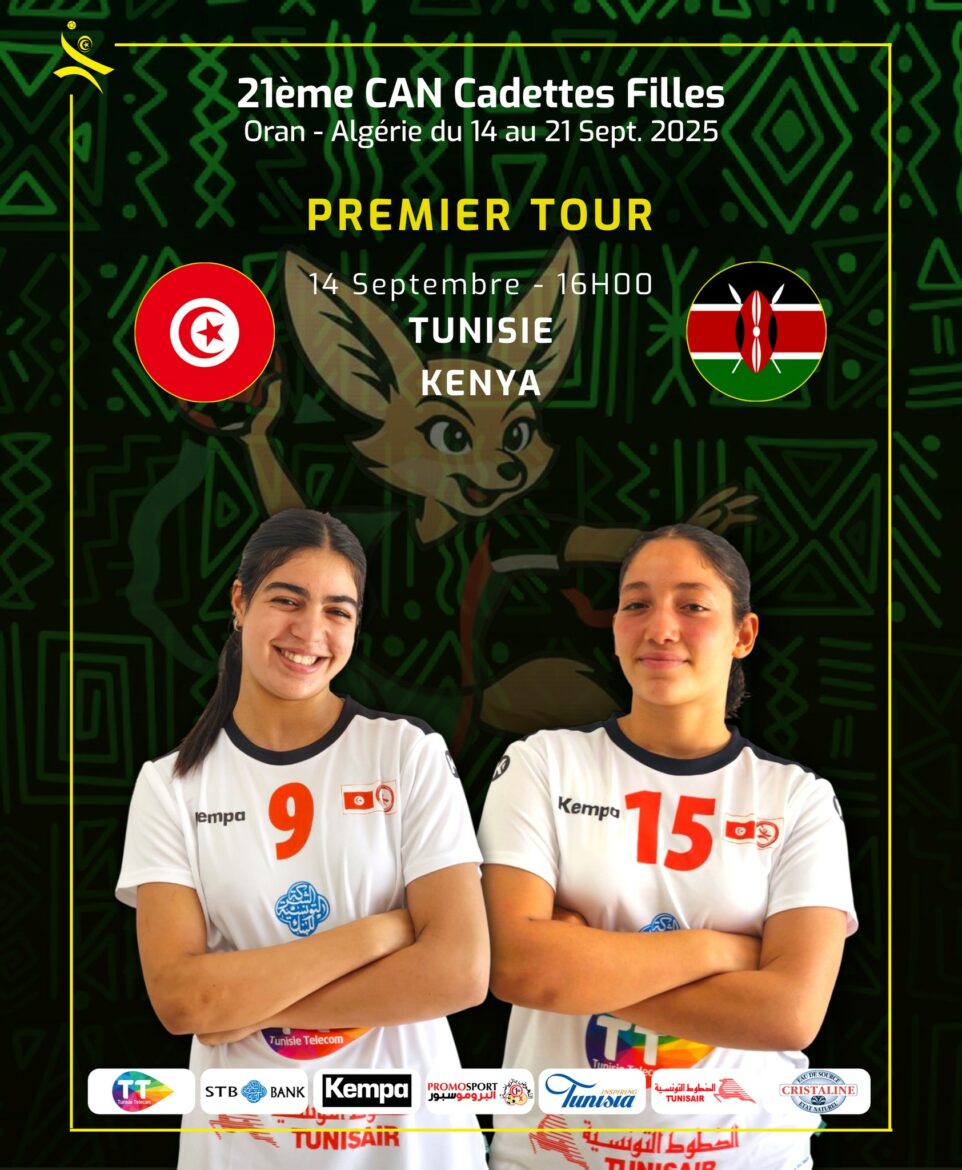 يفتتح المنتخب الوطني التونسي لكرة اليد صغريات اليوم الأحد 14 سبتمبر 2025 مشواره في كأس إفريقيا للأمم و المقام حاليا في مدينة وهران الجزائرية بمواجهة المنتخب الكيني في إطار منافسات الجولة الأولى إنطلاقا من الساعة الرابعة مساءا