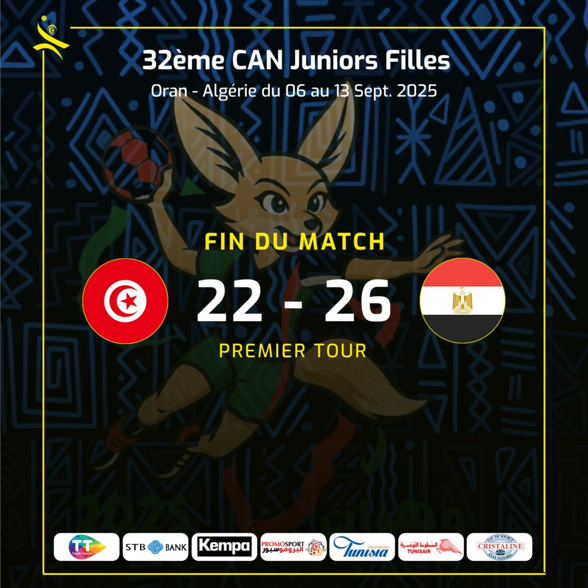 تعرض المنتخب الوطني التونسي للوسطيات للهزيمة الأولى في مسابقة كأس أمم إفريقيا و المقامة حاليا في مدينة وهران الجزائرية و ذلك أمام المنتخب المصري بنتيجة 22-26 في إطار الجولة الرابعة هذا و ينهي منتخبا الوطني الدور الأول اليوم بمواجهة منتخب الكونغو الديمقراطية إنطلاقا من الساعة الثانية بعد الزوال
