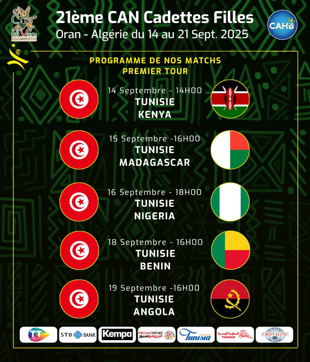 يستعد المنتخب الوطني للصغريات مواليد 2008 للمشاركة في بطولة إفريقيا للأمم لكرة اليد و التي ستدور خلال الفترة المتراوحة بين 14 و 21 سبتمبر 2025 بمدينة وهران الجزائرية والمرشحة لبطولة العالم للصغريات القادمة و في ما يلي برنامج مقابلات عناصرنا الوطنية : الأحد 14 سبتمبر 2025 : 14:00 تونس - كينيا الإثنين 15 سبتمبر 2025 : 16:00 تونس - مدغشقر الثلاثاء 16 سبتمبر 2025 : 18:00 تونس - نيجيريا الخميس […]