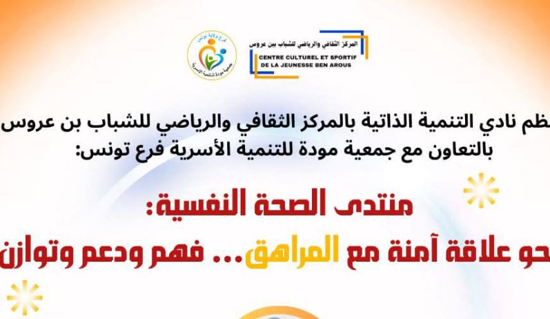 insert_link Non classé 17 ديسمبر: بن عروس تحتضن منتدى الصحة النفسية للمراهقين ينظم نادي التنمية الذاتية بالمركز الثقافي والرياضي للشباب ببن عروس بالتعاون مع جمعية مودة للتنمية الأسرية فرع تونس، منتدى الصحة النفسية للمراهقين، وذلك يوم الاربعاء 17 ديسمبر الجاري. ويهدف المنتدى التوعوي الذي يشارك فيه خبراء في التربية والمجال الاجتماعي وعلم النفس الى التباحث والنقاش حول علاقة التلميذ المراهق بالاولياء والمربين وكيفية بناء علاقة صحية ومتوازنة داخل الاسرة والمجتمع. ويتضمن البرنامج ورشات حول " المراهق بين مشاكل النمو والاحتياجات النفسية...أدوات للفهم […] today13 ديسمبر 2025