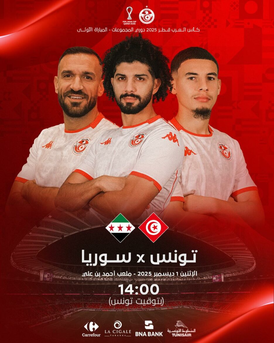 insert_link رياضة كأس العرب : التشكيلة المحتملة للمنتخب الوطني التونسي في مواجهة سوريا يلاقي المنتخب الوطني التونسي اليوم الإثنين 01 ديسمبر 2025 نظيره السوري في إطار الجولة الإفتتاحية من مسابقة كأس العرب ضمن منافسات المجموعة الأولى على ملعب أحمد بن علي إنطلاقا من 14:00 بتوقيت تونس بإدارة الحكم الكوستاريكي خوان غابرييل و في ما يلي التشكيلة المحتملة لعناصرنا الوطنية : حارس المرمى : أيمن دحمان خط الدفاع : محمد بن علي - مروان الصحرواي - أسامة الحدادي - علي معلول وسط الميدان : […] today1 ديسمبر 2025