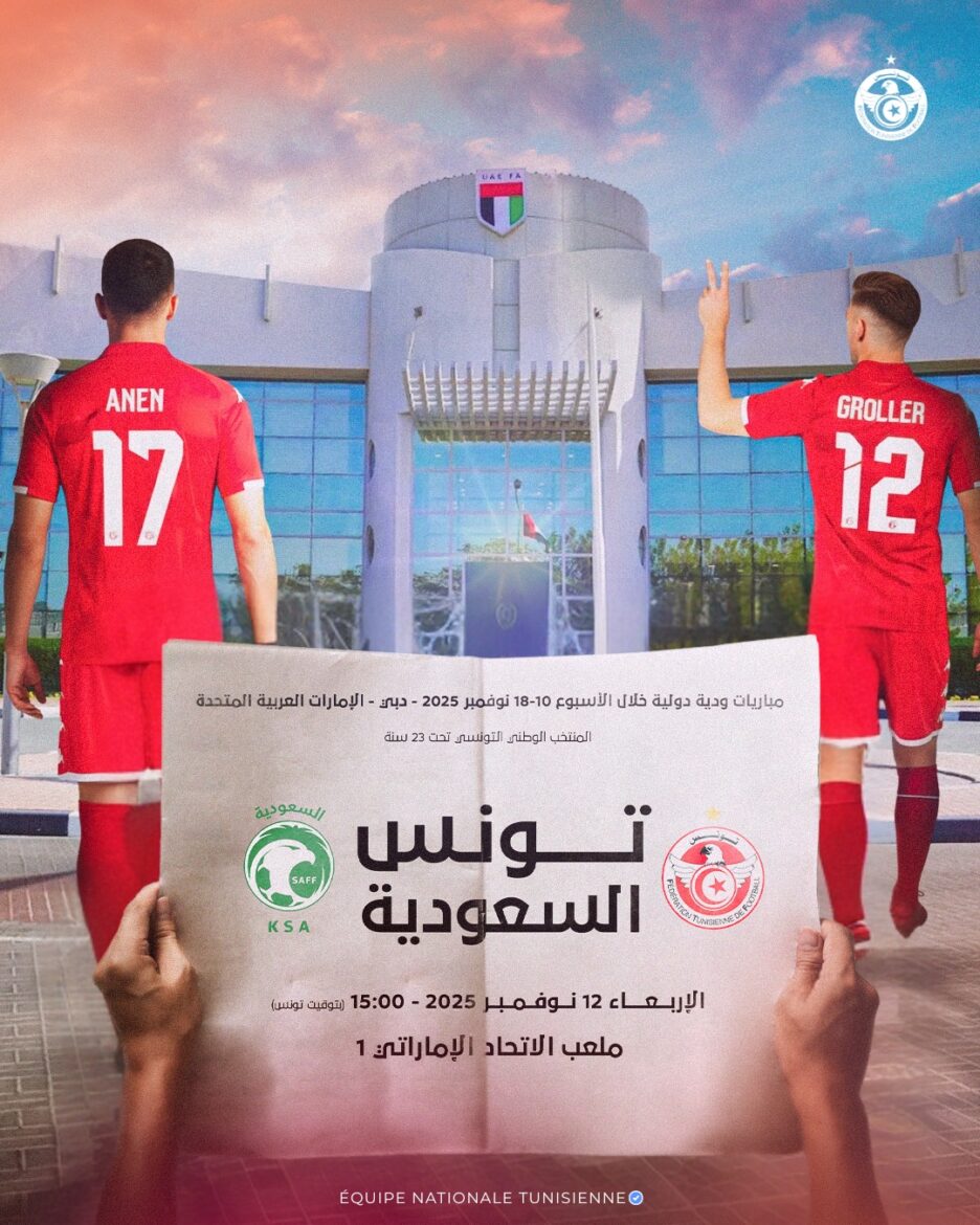 insert_link رياضة المنتخب الوطني الأولمبي يواجه اليوم المنتخب السعودي وديا يواجه المنتخب الوطني التونسي الأولمبي تحت 23 عام اليوم الأربعاء 12 نوفمبر 2025 نظيره السعودي وديا على ملعب الإتحاد الإماراتي عدد 1 في مدينة دبي إنطلاقا من الساعة 15:00 بتوقيت تونس today12 نوفمبر 2025